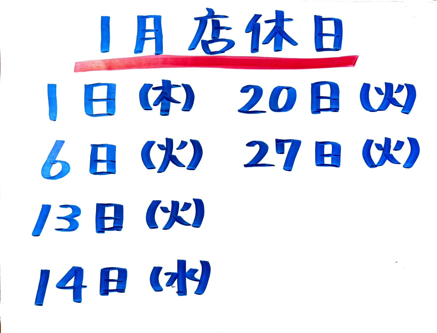 2026年1月の店休日
